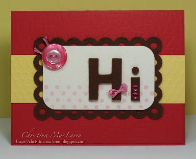 I used the Mojo Monday sketch, opting for the square version as I am still circle phobic! I used PTI's 2009 Autumn Tags to stamp the wreath image and sentiment, then colored the leaves with my Prismas. See that cute, stamped background pattern? It comes from a little set of $1 stamps by Studio G, found at Michaels. It doesn't line up as easily as larger stamps, and the quality obviously isn't as good as more expensive versions, but for price it works for me!